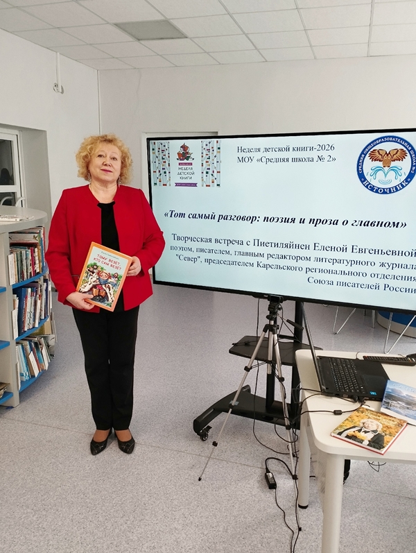 23 марта главный редактор журнала «Север» Елена Пиетиляйнен в преддверии Недели детской книги провела творческую встречу с учащимися 10А класса школы № 2 «Тот самый разговор: поэзия и проза о главном». Это была не просто лекция, а живой диалог, полный вопросов, откровений и вдохновения. Особенно проникновенным моментом стало чтение стихов. На встрече звучали строки о суровой и невероятно красивой природе родной Карелии, о любви, которая согревает сердце, и, конечно, о России.