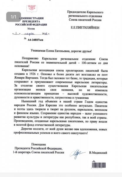 И сегодня, традиционно в этот день, состоится годовое собрание Карельского регионального отделения Союза писателей России, посвященное 100-летию создания писательской организации Карелии. Нам очень радостно, что с таким большим юбилеем членов КРО СПР поздравил 1-й секретарь Союза писателей России Владимир Мединский!